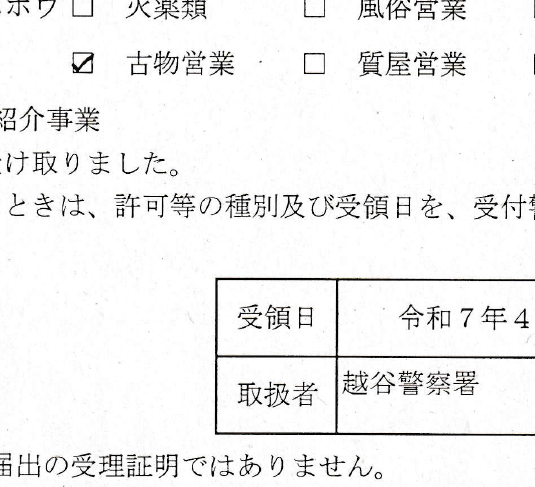 越谷警察は駅から近いとは言えない距離ですので、やり直しを考えますと弊所にご依頼されるのも手かもしれません。古物商営業許可はお安く申請までやっていますので是非検討お願いいたします。